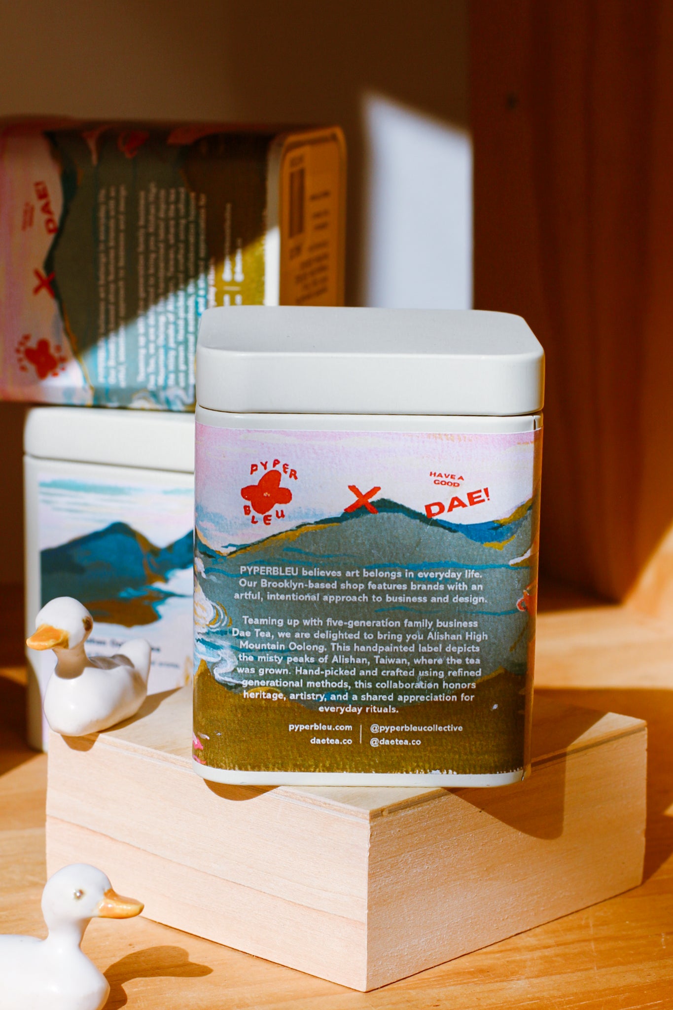 Teaming up with five-generation family business Dae Tea, we are delighted to bring you Alishan High Mountain Oolong. This handprinted label depicts the misty peaks of Alishan, Taiwan, where the tea was grown. Hand-picked and crafted using refined generational methods, this collaboration honors heritage, artists, and a share appreciation for everyday rituals.